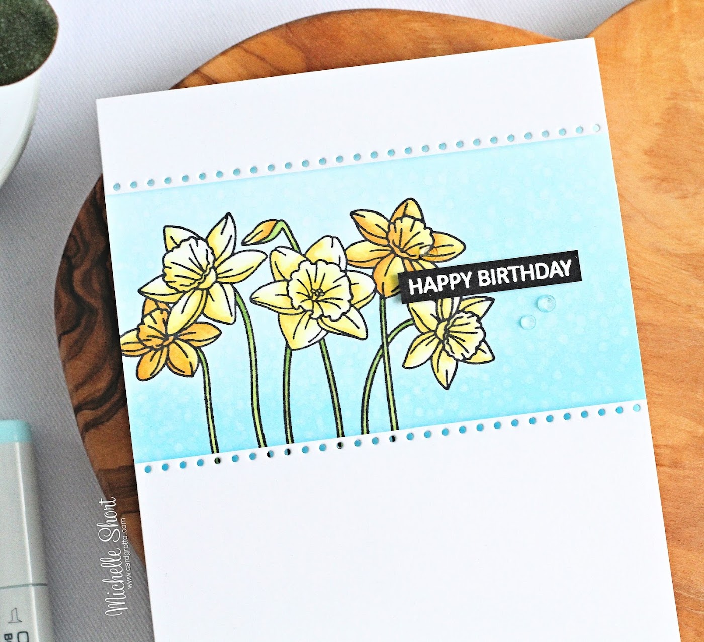 COPIC MARKERS: Daffodils - Y38, Y35, Y17, Y15, Y13, Y11, Y00, Y000, Y0000. Stems - G46, G34, YG03. Background - B00, B000, B0000, 0.