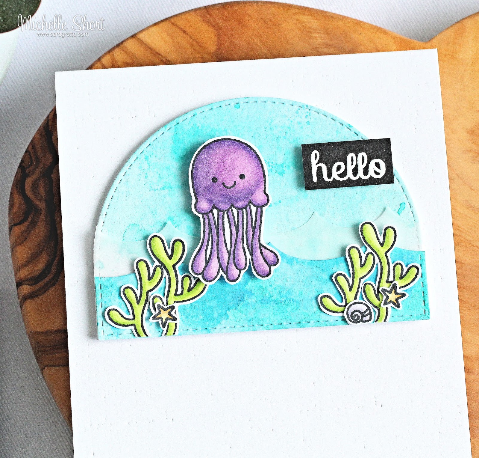 COPIC MARKERS: Jellyfish - Y17, Y15, Y12. Seaweed - YG17, YG23, YG03, YG01. Starfish - YR12, Y17, Y11. Shell - BV11, BV000.