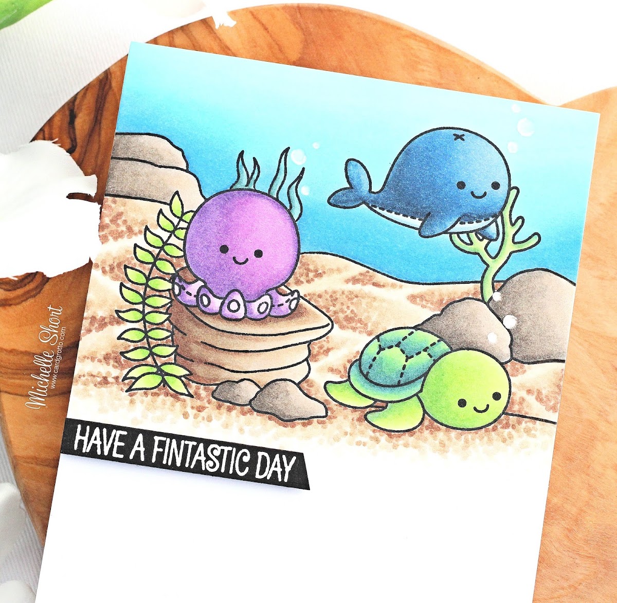 I started off by stamping the Water Plushies on to a panel of white cardstock with Memento Tuxedo Black. I made masks for these and then stamped the Picture It Ocean on top. This creates the most wonderful background for underwater scenes. I removed the masks and then coloured the panel with Copic Markers (the colours that I used are listed below the supplies section).