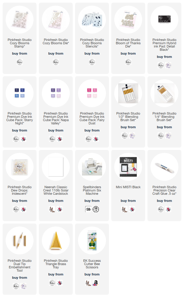 I started off my card by stamping the two floral images from the Pinkfresh Studio Cozy Blooms Stamp Set onto white cardstock using Pinkfresh Studio Detail Black Hybrid Ink. I then used the Pinkfresh Studio Cozy Blooms Stencils to colour the images in using ink blending.