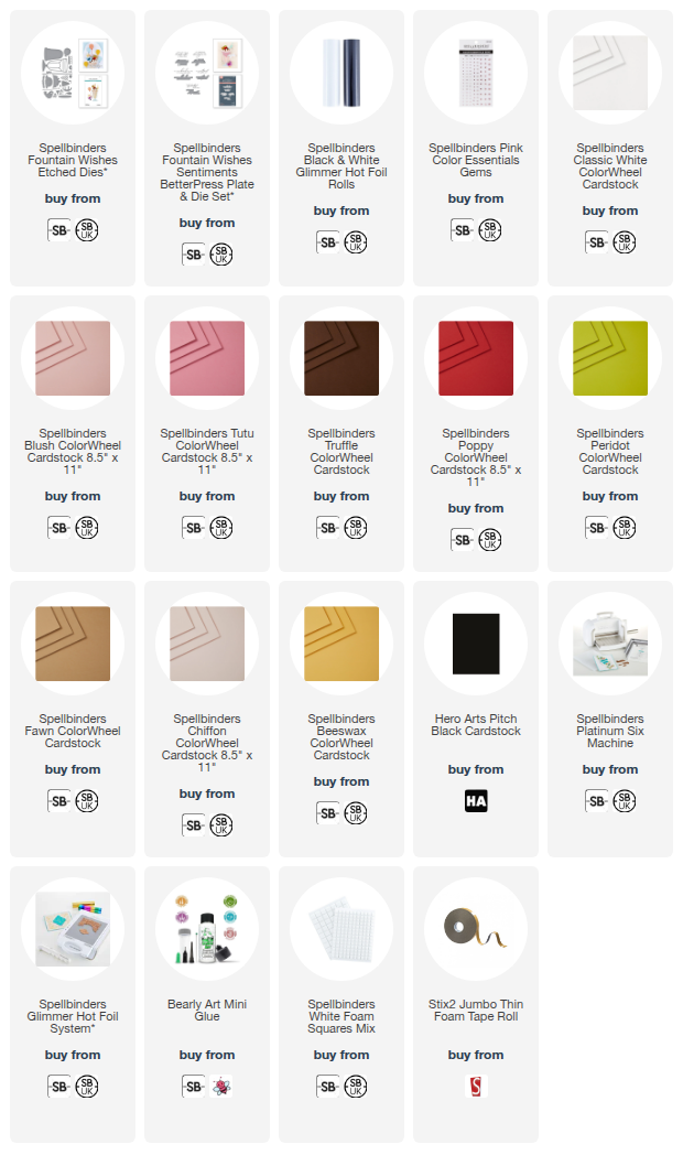 I hot foiled the sentiment from Spellbinders Fountain Wishes Sentiments BetterPress Plate & Die Set onto white cardstock using Spellbinders Opaque Black Foil and the Glimmer Hot Foil System. It was die cut out using the coordinating die and I also cut the die again from white cardstock and adhered that layer behind the foiled one for dimension. It was adhered to the card with foam squares. To finish, I embellished with Spellbinders Pink Color Essentials Gems.