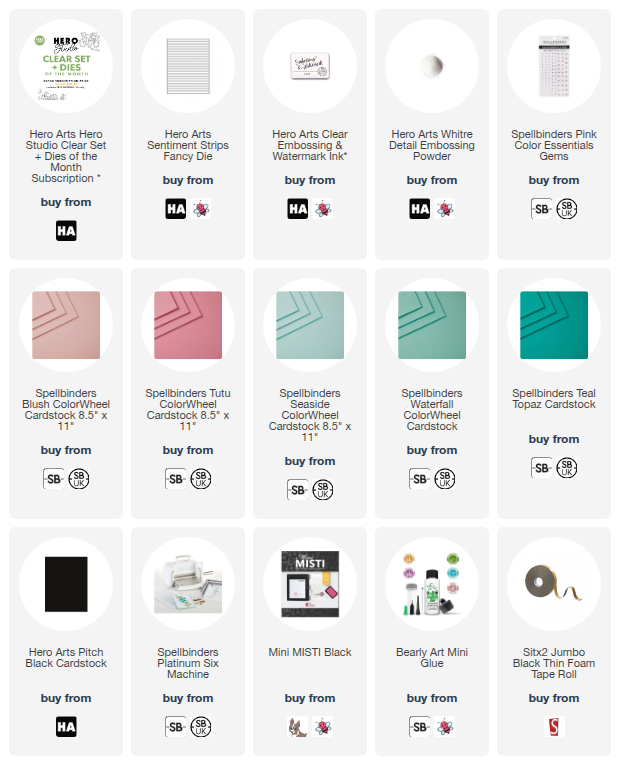 I die cut the Hero Arts Sentiment Strips Fancy Die from Spellbinders ColorWheel Cardstock in Blush, Tutu, Seaside, Waterfall and Teal Topaz. The strips were adhered to a black A2 sized card base using liquid glue. The image was then adhered on top using thin foam tape. To finish, I added a Spellbinders Pink Color Essentials Gem to the centre of the flower in the image.