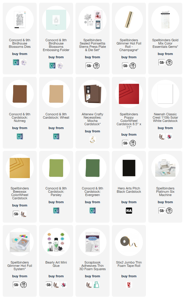 The bird was adhered also using thin foam tape. I cut the heart twice from Spellbinders Poppy ColorWheel Cardstock and adhered it to the house (one on top of another). The sentiment, from Spellbinders Sealed Poinsettia Stems Press Plate, was hot foiled onto white cardstock using Spellbinders Champagne Foil and the Glimmer Hot Foil System. It was cut into a strip and adhered to the card with foam tape. To finish, I embellished with Spellbinders Gold Mix Color Essentials Gems.