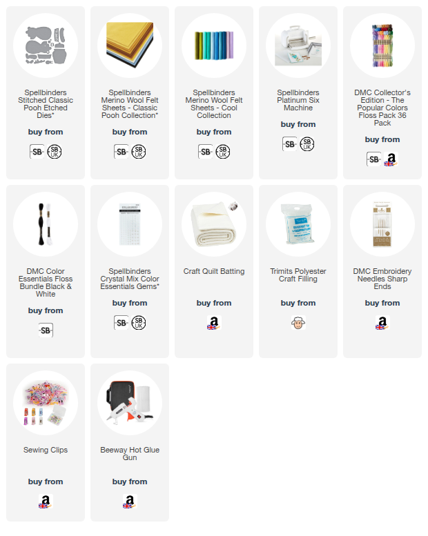 Hello there, if you have been a follower of my blog for a while, you will know that I have been doing some felt stitching projects from time to time. Today I have my last one of the year to share and he is a cutie! As soon as I saw the Spellbinders Stitched Classic Pooh Collection I knew I wanted to make a plushie for my very dear friend Sarah. It took a little longer than I hoped to get him to her, but I got there in the end!