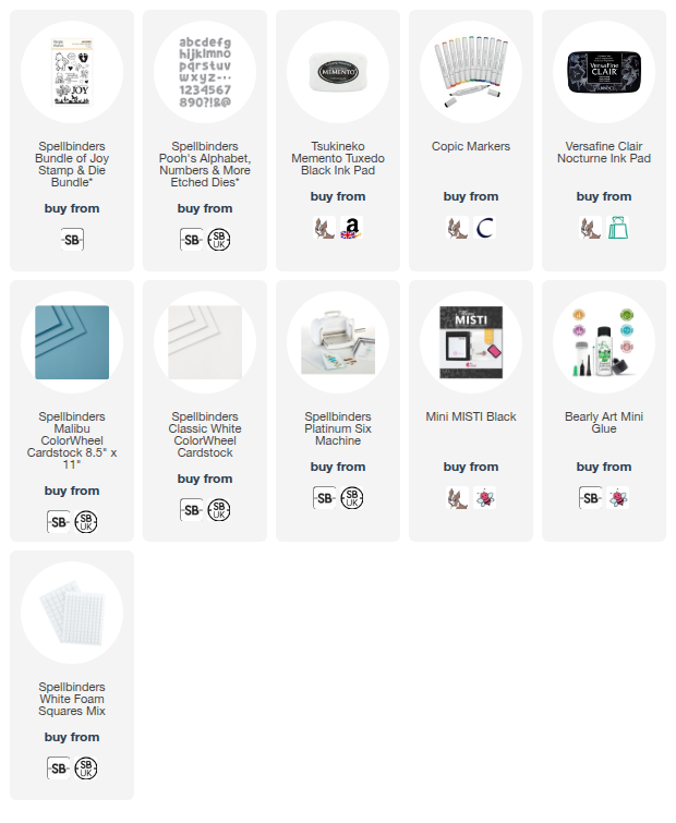 The peek above uses the Spellbinders Bundle of Joy Stamp & Die Set which is a collaboration with Simple Stories. I used the 'b' on the block that Pooh is leaning on to complete the 'baby' word made using Spellbinders Pooh's Alphabet, Numbers & More Etched Dies (which is an older set). Love that Spellbinders Malibu ColorWheel Cardstock and thought it went well with the yellow on Pooh!