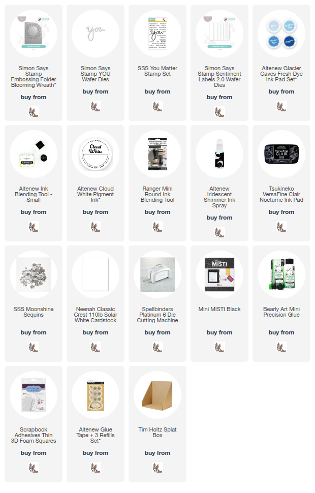 To highlight the wreath a little, I pounced Altenew Cloud White Pigment Ink on top, using a Blending Tool. I then placed it inside my splat box and liberally sprayed on Altenew Iridescent Shimmer Ink Spray before setting it aside to dry.