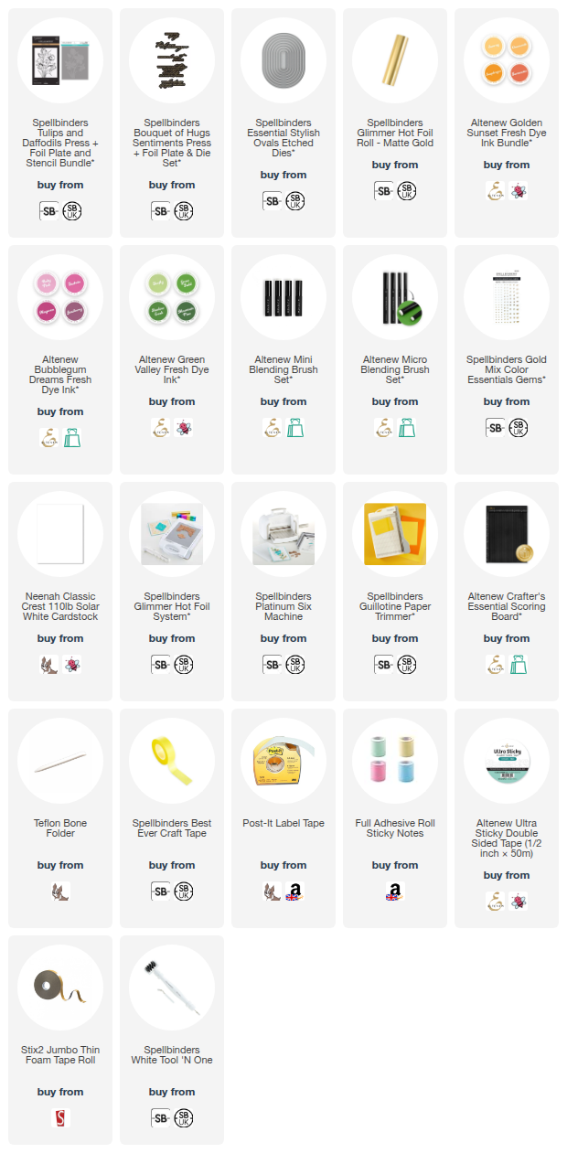 Hello there, today I have a card and video to share using Yana's Tulips Collection from Spellbinders. I am hot foiling and stencilling the Tulips & Daffodils Press + Foil Plate and the image is oh so pretty! Lots of different colour combinations could be used here, but I went with traditional yellow daffodils and pink tulips!